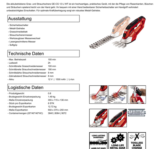Einhell 3410401 GE-CG 12 Li 2in1 Akku-Gras/Strauchschere inkl. Teleskopstiel - Li-Ion