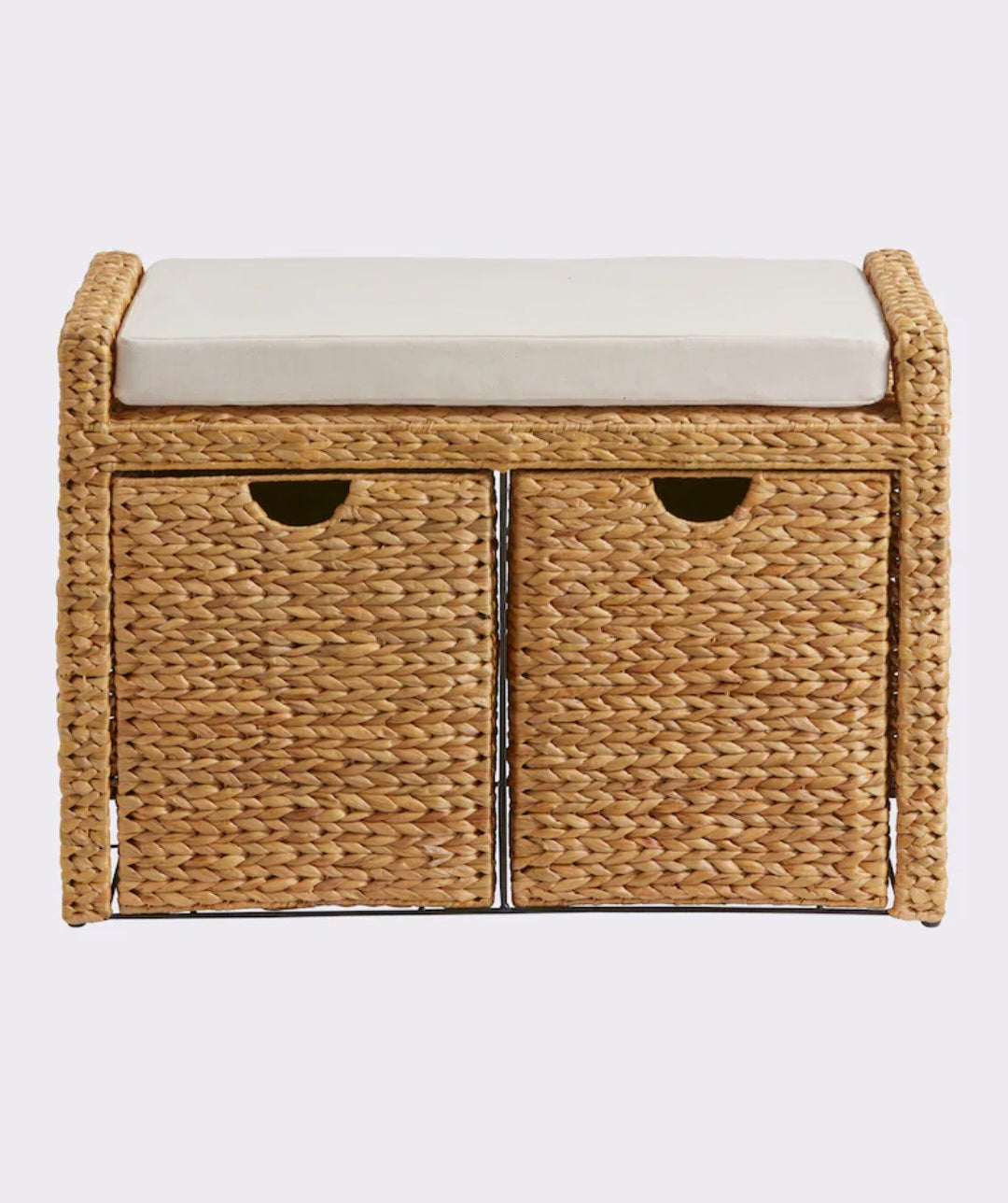Bank Bietet viel Stauraum. Stabiles Metallgestell, umflochten mit Wasserhyazinthe. Sitzpolster aus Schaumstoff, abnehmbarer Textilbezug aus 100% Baumwolle. Mit 2 Körben. Aufgebaut.