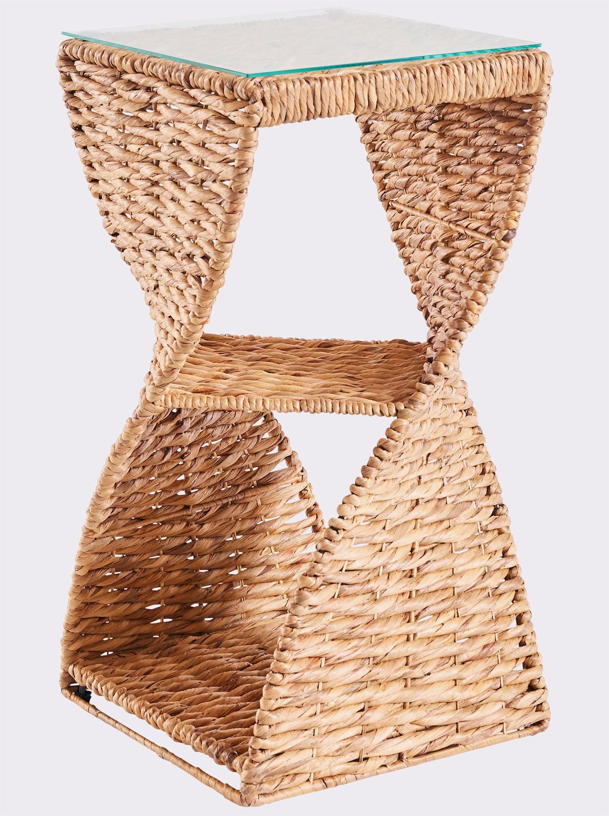 Beistelltisch Gestell aus Metall, mit Wasserhyazinthe umflochten. Zusätzliche Ablagefläche. Glas-Einlegeplatte.