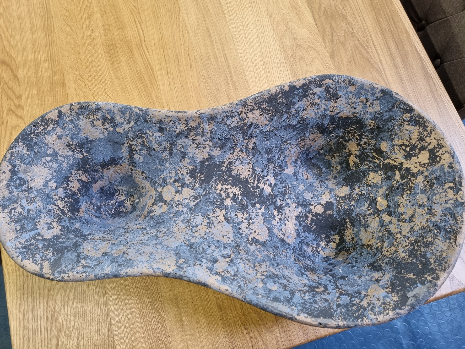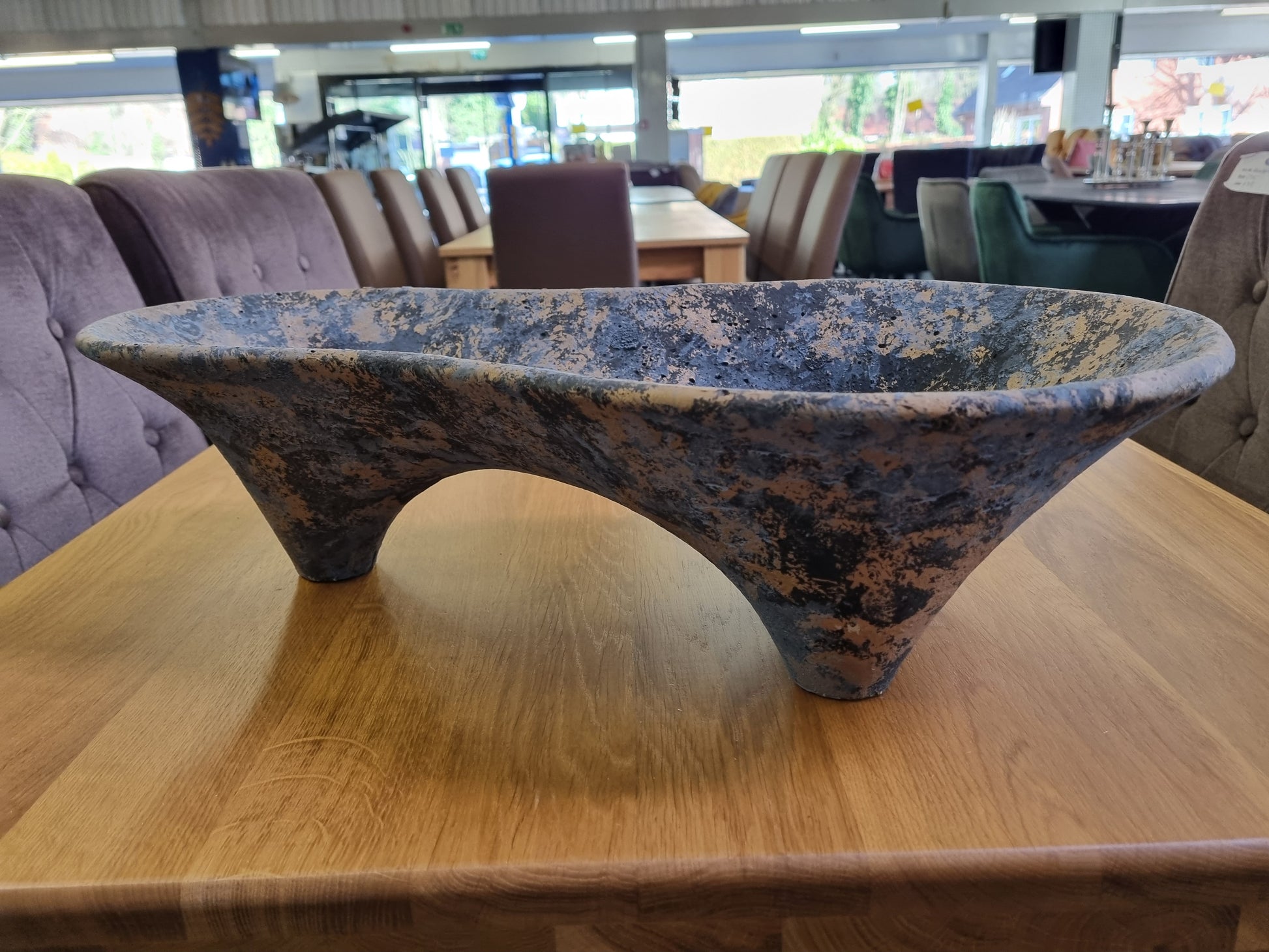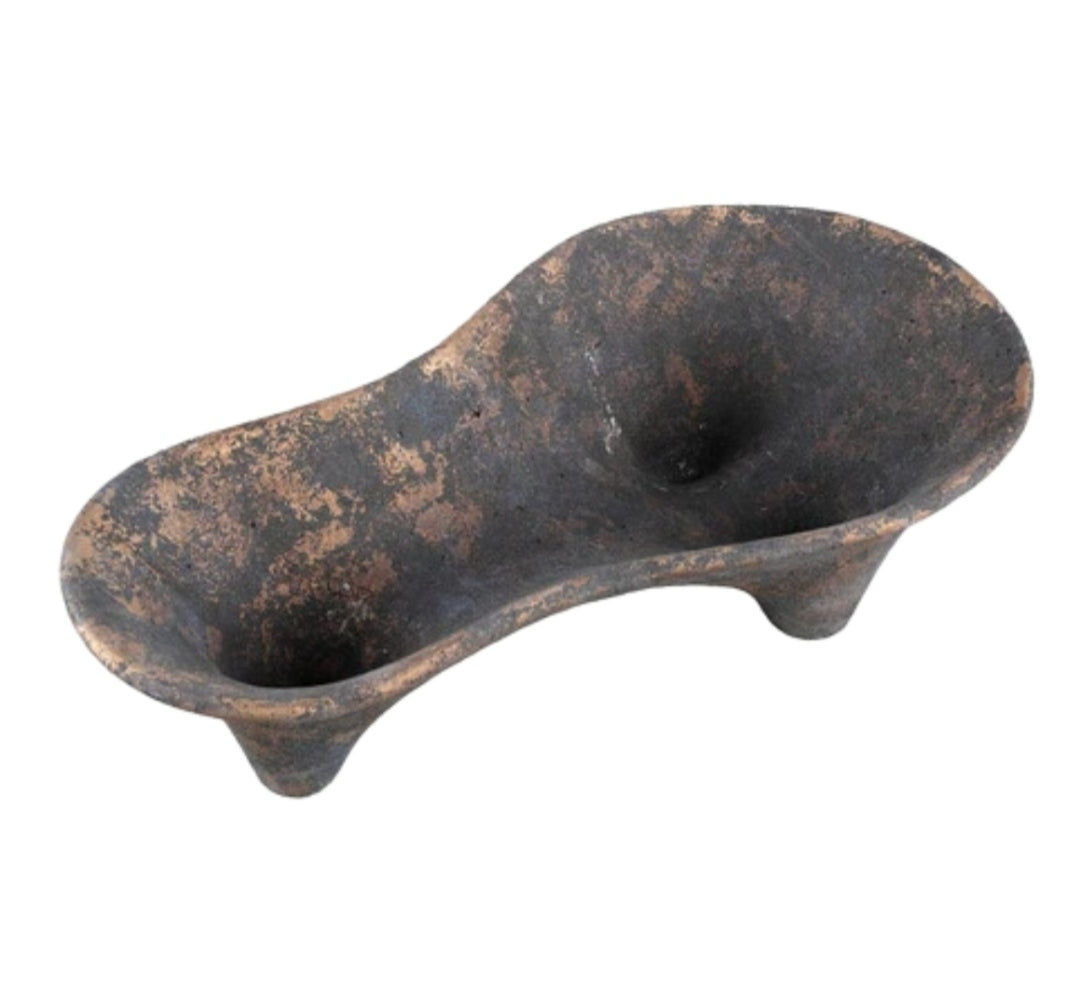 Der Blumentopf steht auf 3 Beinen und hat eine raue Oberfläche.