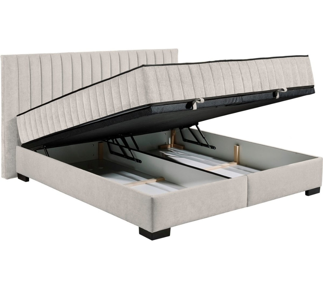 Eine Besonderheit ist der integrierte Bettkasten unter der Liegefläche, zugänglich durch das Anheben des Matratzenrahmens. Dies bietet eine praktische Lösung zur Aufbewahrung von Decken, Kissen, Bettwäsche oder Kleidung.