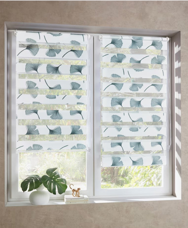 Doppelrollo Digital bedruckt, mit Gingko-Motiven. Sehr variabel: Bietet leichte Transparenz bis hin zu Licht- und Sichtschutz. Durch Ziehen am Kettenzug einstellbar. Beschwerungsstange unten. Klemmträger-System für werkzeugfreie Montage am Fensterrahmen.