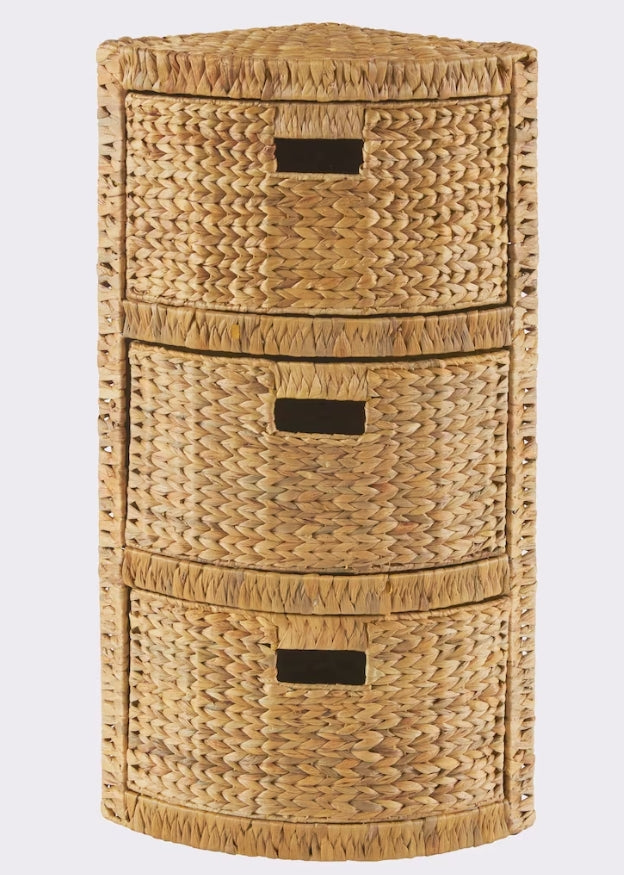 Kommode Ideal für die Ecke. Stabiles Metallgestell, von Hand mit Wasserhyazinthe umflochten. Einschubkörbe mit Griffmulde. Verstellbare Kunststoffnoppen zum Ausgleichen von Boden-Unebenheiten. Aufgebaut.