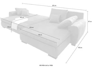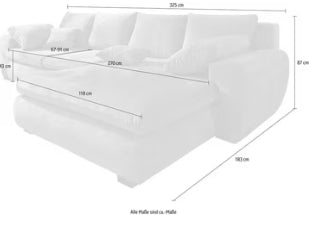 - Schenkelmaße (B/T): 183/325 cm (Recamiere links)