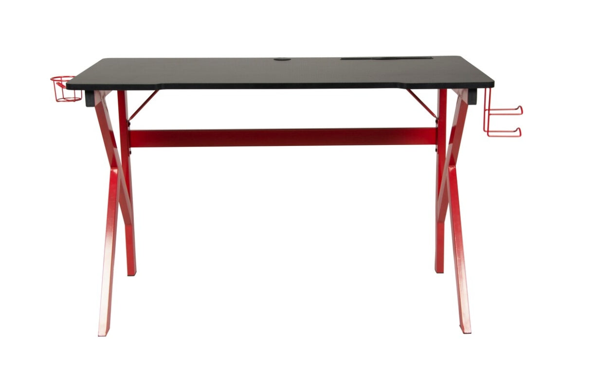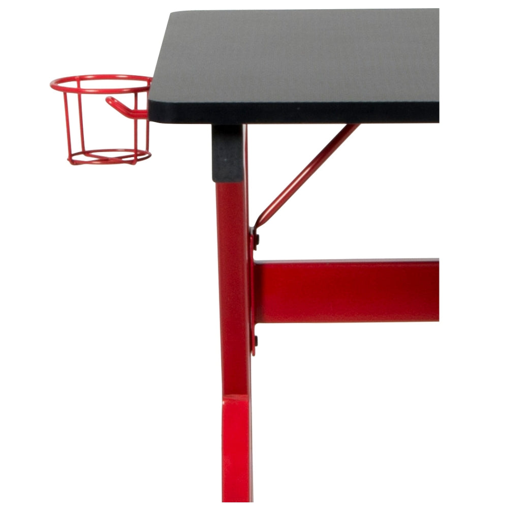 - Gamingtisch mit stylischer Carbon-Optik und roten Metallbeinen.