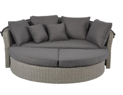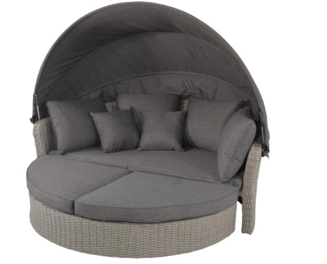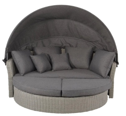 Die hochwertige Loungeinsel aus bestem Polyrattan und dicker Polsterung lädt zum Entspannen ein. Mit einer tollen Optik und Haptik sowie feinen Details in Austern Form, überzeugt die runde Lounge Liege auf ganzer Linie. Das große Dach der Rundliege bietet Schutz und Gemütlichkeit für entspannte Stunden im Freien. Die Liege wird mit dicker Polsterung für die Liegefläche und passenden Kuschelkissen geliefert. Das wetterfeste Aluminiumgestell, das Polyrattan Kunstgeflecht in Mixed Grey und das Polyesterpolster sorgen für Langlebigkeit und Komfort. Das Dach lässt sich mithilfe von Gasdruckdämpfern einfach öffnen.
