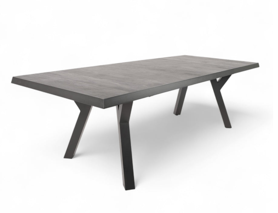 Mit seinem eleganten Aluminiumgestell und der innovativen Oberfläche aus Keramiklamellen in Anthrazit vereint dieser Tisch Luxus mit Langlebigkeit. Perfekt für alle, die ihren Wohnraum im Freien stilvoll gestalten möchten.