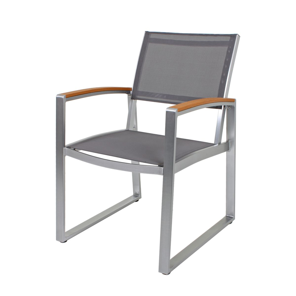 Der Rahmen des Stuhls ist aus robustem, grauem Aluminium gefertigt, was nicht nur für Stabilität, sondern auch für Langlebigkeit und Rostbeständigkeit sorgt. Die Sitz- und Rückenfläche besteht aus strapazierfähigem Kunststoffgewebe in einem warmen grauen Ton, was nicht nur ästhetisch ansprechend ist, sondern auch bequemen Sitzkomfort bietet.