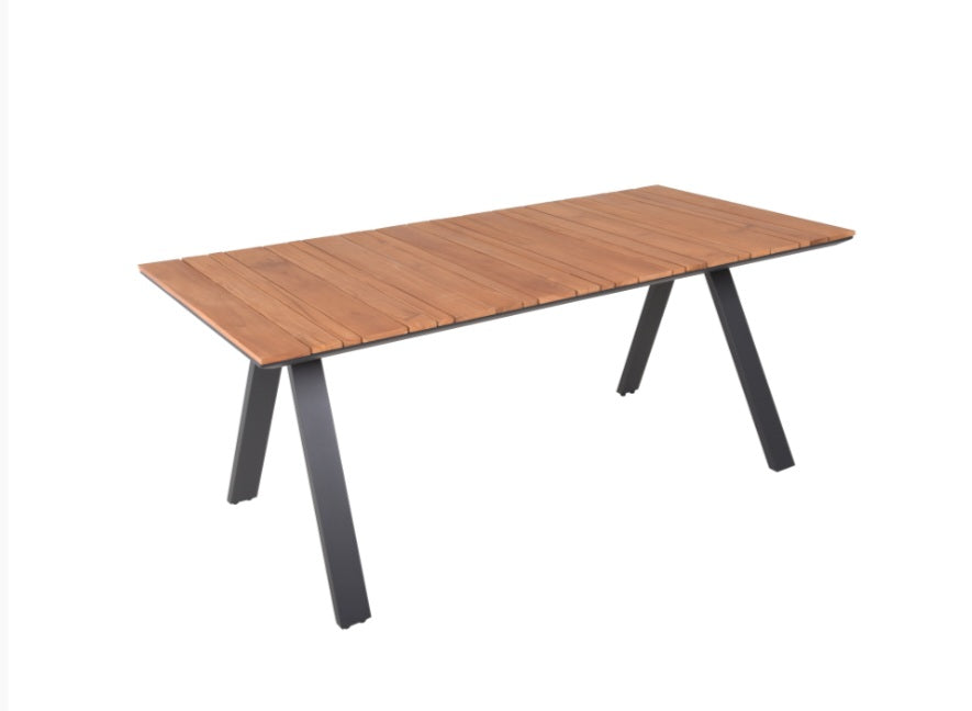 Dieser Tisch eignet sich perfekt für Mahlzeiten im Freien, gesellige Zusammenkünfte oder entspannte Momente. Mit seinem zeitgemäßen Design und den hochwertigen Materialien wird der Tisch sicherlich zu einem Blickfang in Ihrem Raum und bietet gleichzeitig Komfort und Funktionalität. Das Teakholz verleiht dem Tisch eine natürliche Schönheit, während das pulverbeschichtete Aluminium für Stabilität und Wetterbeständigkeit sorgt..