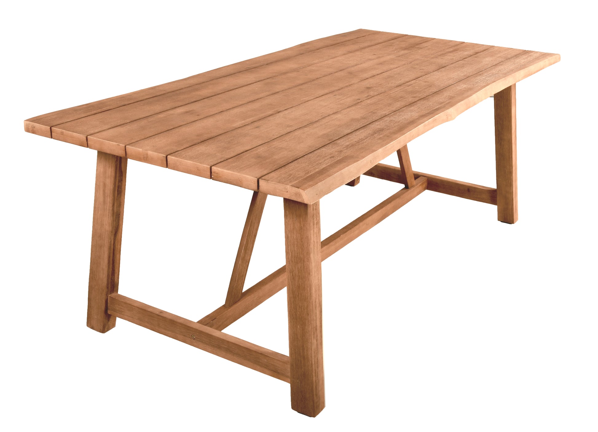 Der rechteckige Tisch besteht aus FSC-zertifizierter Akazie, die laminiert und gebürstet wurde, was ihm ein ansprechendes Erscheinungsbild und zusätzliche Haltbarkeit verleiht.