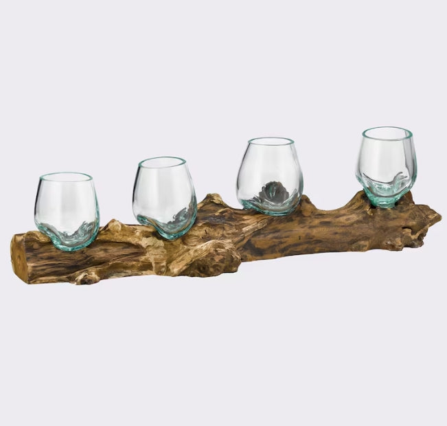 Kerzenleuchter Aus natürlichen Albasiaholz-Wurzeln mit 4 mundgeblasenen Glaseinsätzen, H/Ø ca. 10x8,5 cm. Kunsthandwerklich gefertigt, Farb-, Form- und Maßabweichungen sind möglich. Ohne Kerzen.