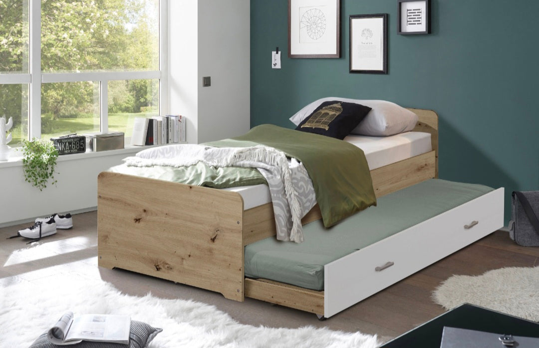 Das Ausziehbett bietet zwei Liegeflächen mit einer Größe von jeweils 90 x 200 cm und schafft damit ausreichend Platz für Gäste, ohne dabei viel Raum einzunehmen. Das kompakte Design ermöglicht es, den verfügbaren Platz optimal zu nutzen - sei es im Kinder-, Jugend- oder Gästezimmer.