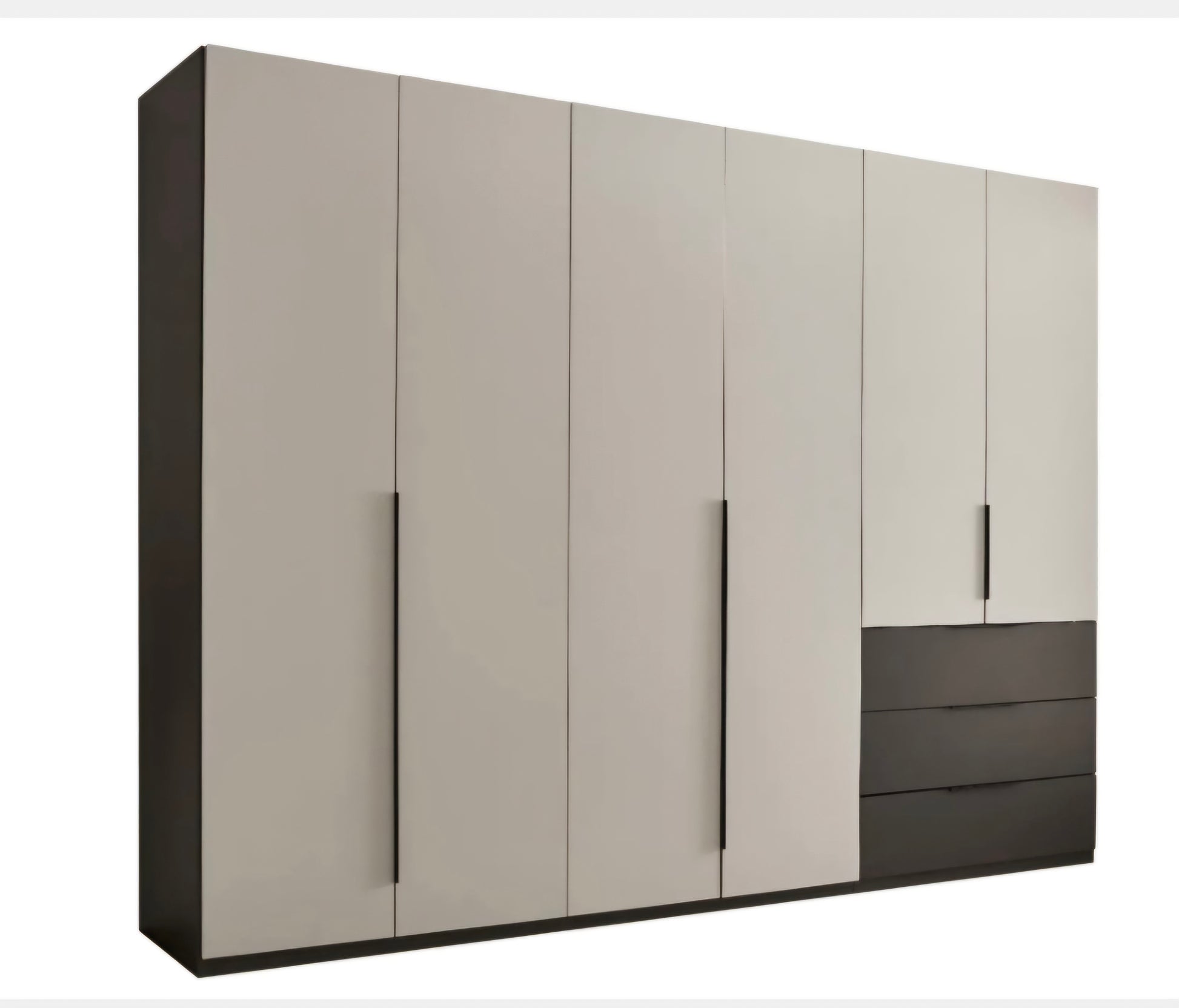 Mit 6 Türen und 3 Schubladen bietet der Kleiderschrank viel Stauraum für Ihre Kleidung und Accessoires und sorgt für eine organisierte und funktionale Raumaufteilung.