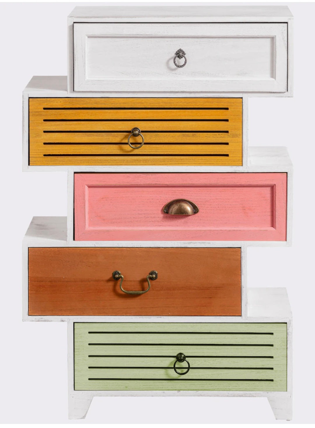 Kommode Aus massivem Paulowniaholz aus MDF. Korpus weiß gewischt. Schubladen auf Holzführung mit unterschiedlichen Fronten und Metallgriffen, Innenmaß H/B/T je ca. 14/45/23 cm. Aufgebaut.