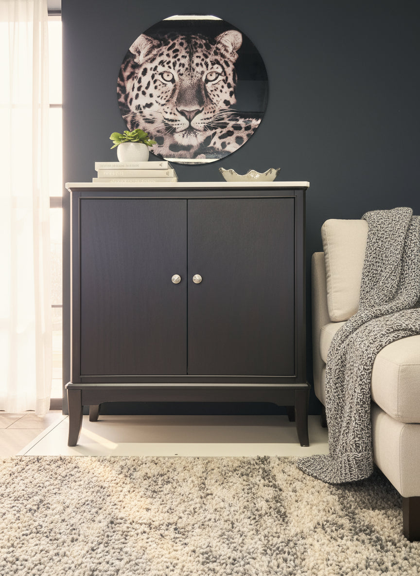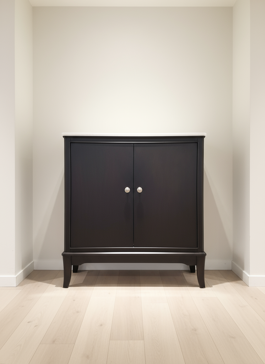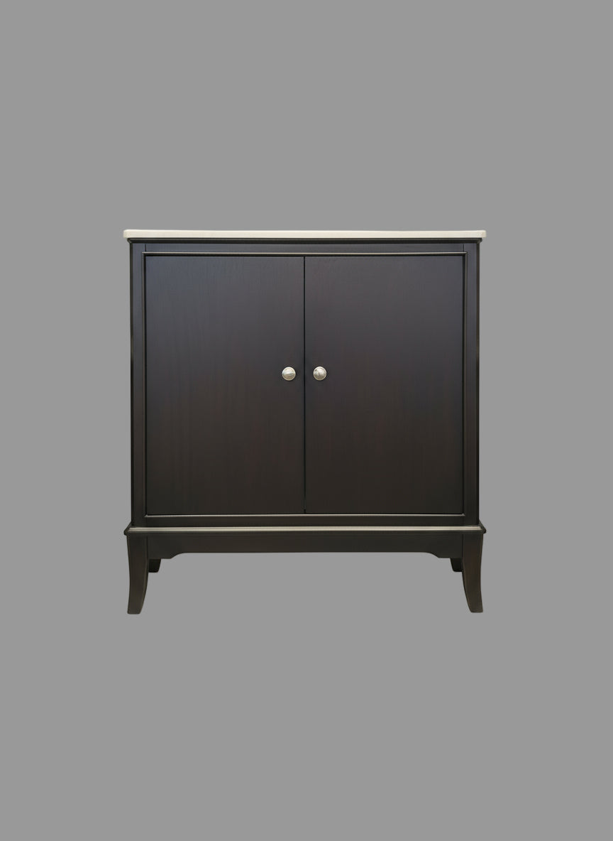 Diese kompakte und stilvolle Kommode vereint klassische Eleganz mit modernem Kontrast. Sie dient ideal als Anrichte oder Schrank zur Aufbewahrung in Wohn-, Ess- oder Schlafzimmern.