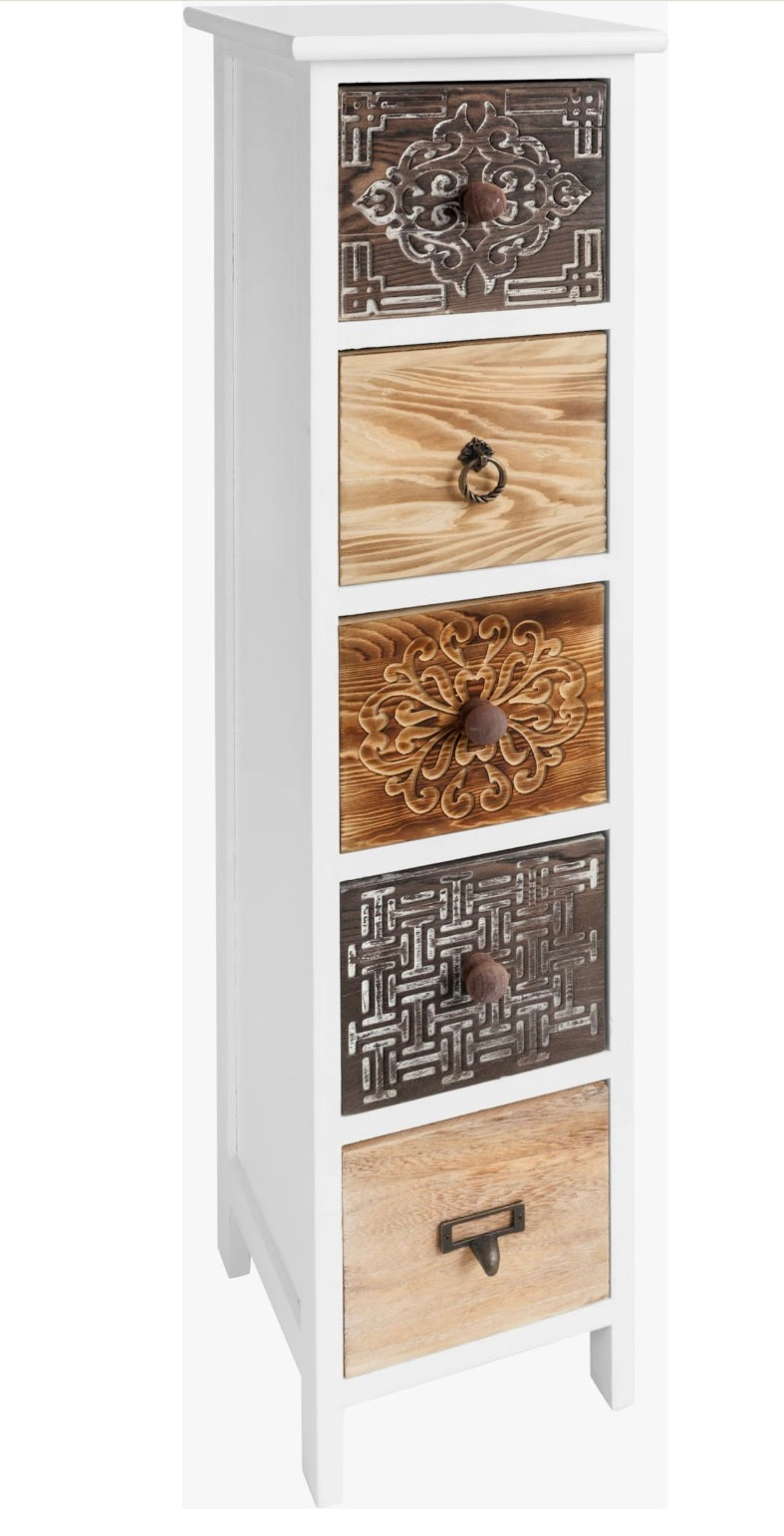 Kommode Teils massives Paulownia-Holz aus China, teils MDF-Hartfaserplatte. Fronten unterschiedlich dekoriert, mit diversen Griffen. Aufgebaut.