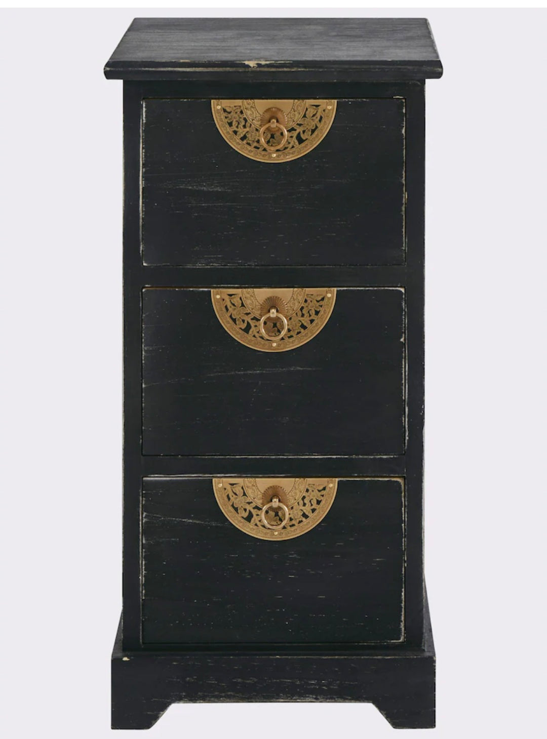 Kommode Aus massivem Kiefernholz aus China, weiß lackiert bzw. schwarz antikisiert im Shabby-Look. Schubladen mit goldfarbenen, antikisierten Metallplatten und Ringen als Griffe. Kunststoffnoppen zur Bodenschonung. Aufgebaut.