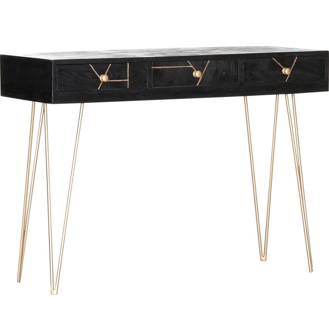 Optisch erweist sich dieser Konsolentisch als echtes Highlight. Er zeichnet sich durch die goldfarbenen Einfräsungen sowie das pulverbeschichtete Metallgestell aus. Dazu punktet er mit einer asymmetrischen Form.