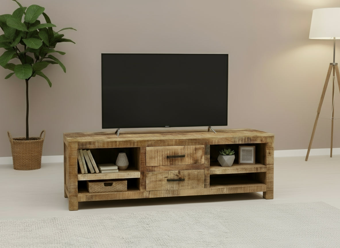 Dieses eindrucksvolle TV-Lowboard vereint Robustheit mit rustikalem Charme und ist die perfekte Basis für Ihre Mediengeräte.