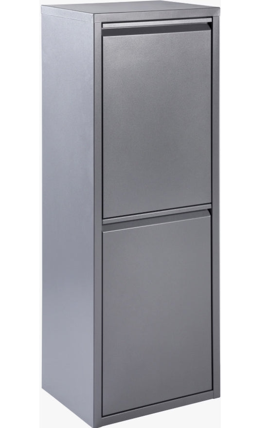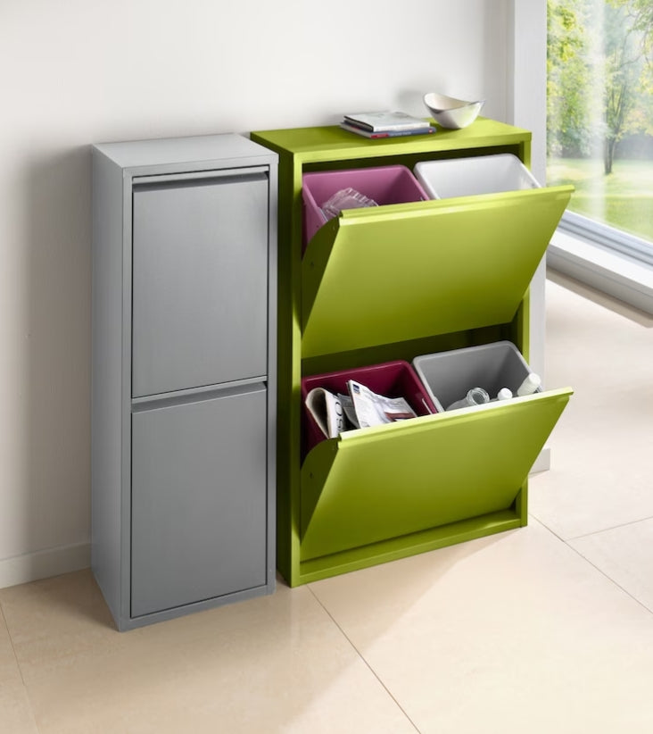 Mülltrenner Aus farbig lackiertem Metall. Frontklappen mit 2 herausnehmbaren Kunststoff-Eimern. Zusätzliche Wandbefestigung möglich.