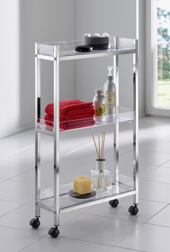 Rollwagen Gestell aus verchromtem Metall, fahrbar auf 4 Rollen. Einlegeböden aus Acrylglas. Selbstmontage.