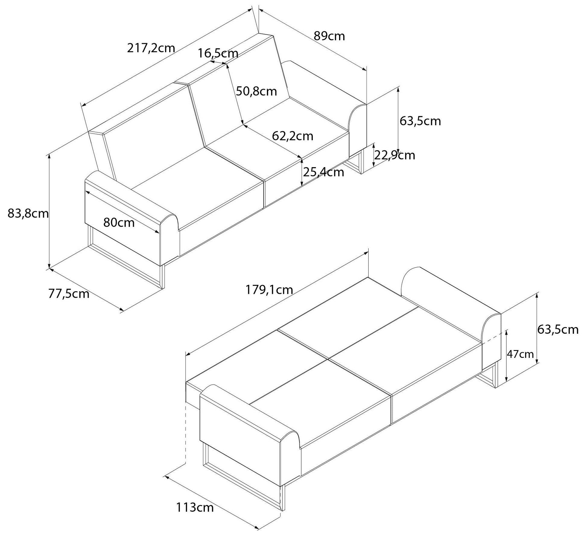 Gesamtmaße (B/T/H) ca. 218/89/84 cm - in Schlafposition ca. 218/113,5/63 cm