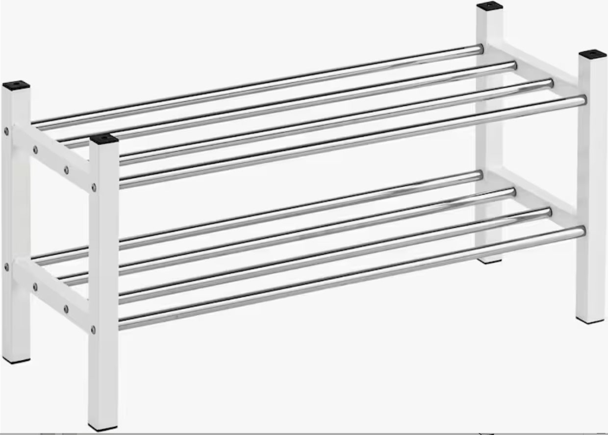 Schuhregal Mit 2 Regalböden für je ca. 4 Paar Schuhe. Aus Metall, Rohre verchromt, Seitenteile lackiert. Mit weiteren Regalen verschraub- und daher stapelbar.