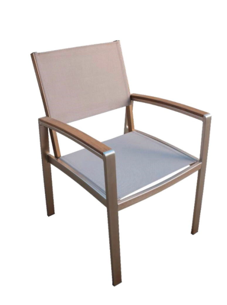 Die Stapelstühle in champagner sind aus hochwertigem gebürstetem grauem Aluminium gefertigt und verfügen über champagnerfarbenes Kunststoffgewebe sowie Nonwood-Armlehnen.