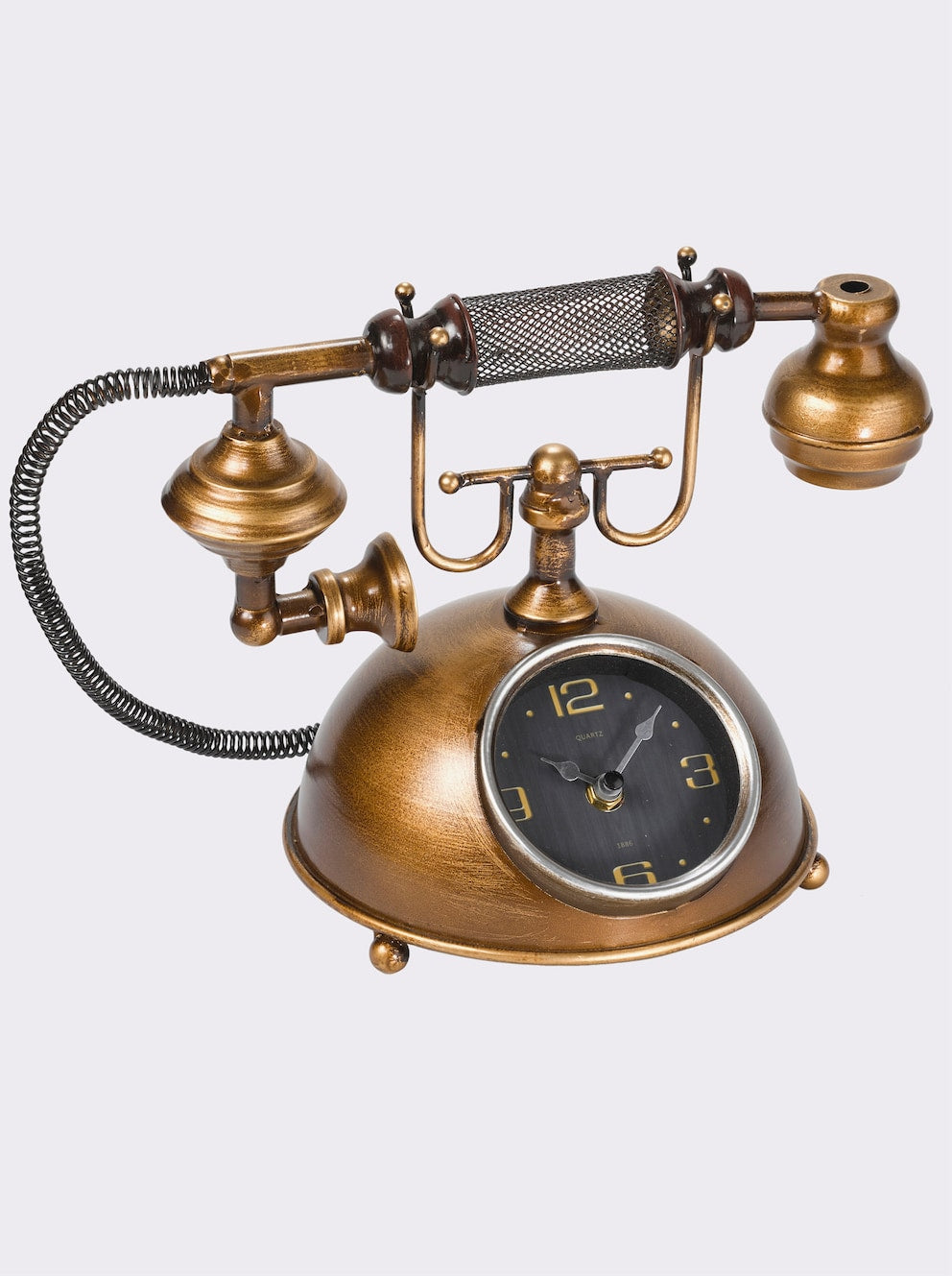 Tischuhr Ganz ausgefallen in der Optik eines antiken Telefons. Aus Metall, antikgoldfarben und braun lackiert und antikisiert. Ohne1,5V-Mignon-Batterie.