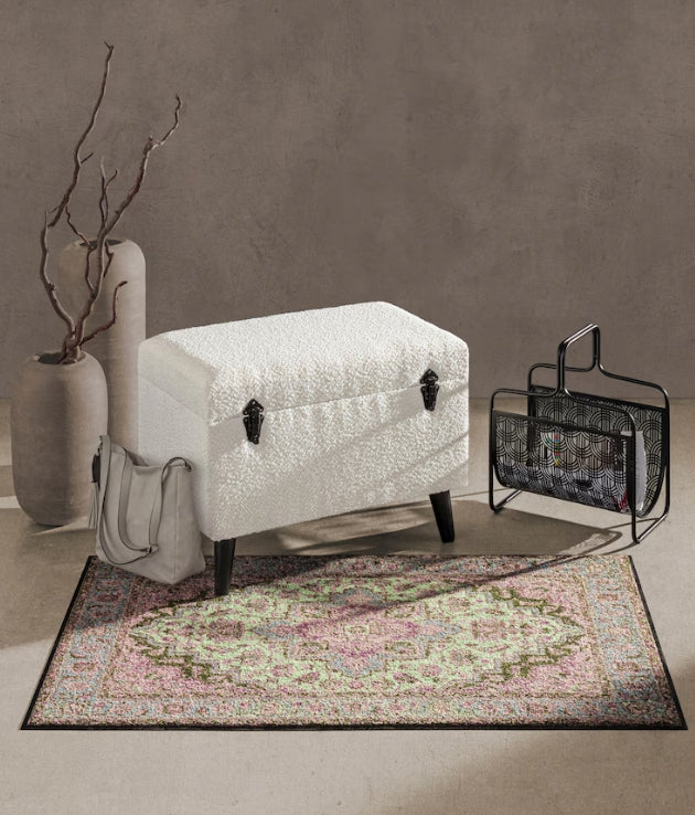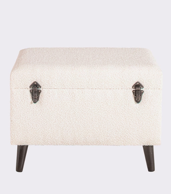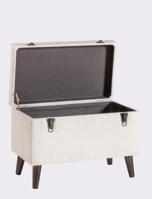 Truhenbank Mit weichem Teddystoff bezogen. Deckel mit Schaumstoffpolsterung, bis 80 kg belastbar. Mit stabilem Aufklapp-Mechanismus aus Metall, darunter ein mit Stoff ausgeschlagener Stauraum. Gestell aus MDF-Holzfaserplatte aus China. Füße aus schwarz lackiertem Tannenholz. Aufgebaut.