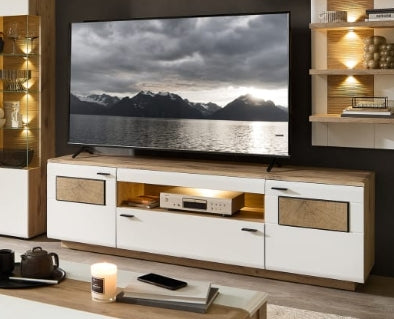 Modernes TV-Board aus der Serie Minoa mit Front in Weiß, matt aus MDF, Korpus in Viking Oak-Nachbildung, geriffelte Rückwände,