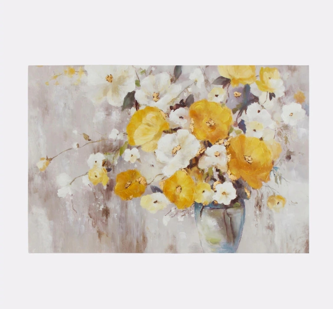 Hochwertiger Kunstdruck mit Blumen-Motiv, teils von Hand bemalt, mit Hoch/Tief-Effekt. Abweichungen möglich. Kunstleinwand auf Holzrahmen gezogen.
