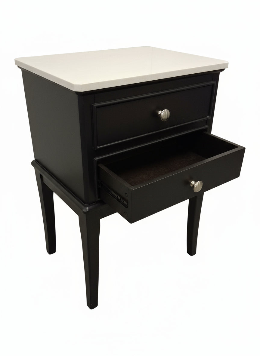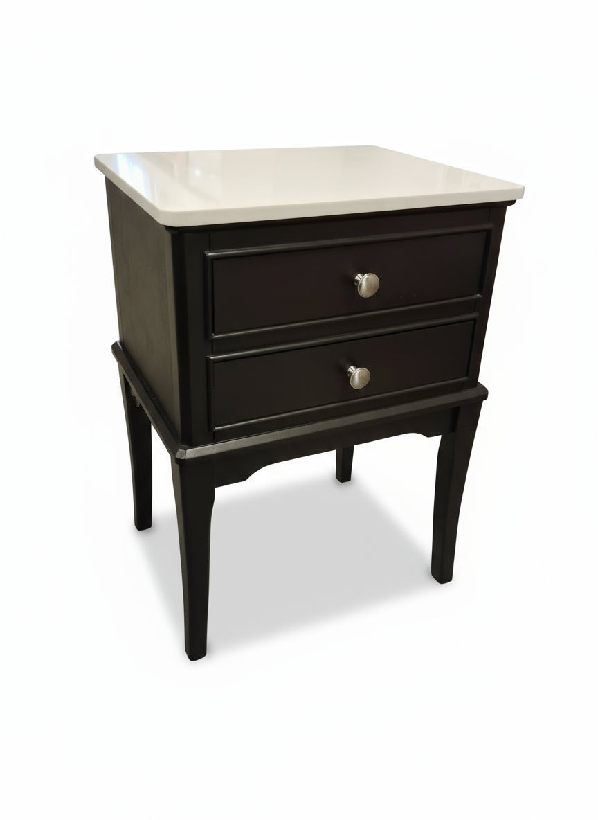 Dieser elegante Nachttisch präsentiert sich in einem klassischen, dunklem Holz. Die Kommode verfügt über eine kontrastierende, moderne weiße Ablagefläche aus Marmor.