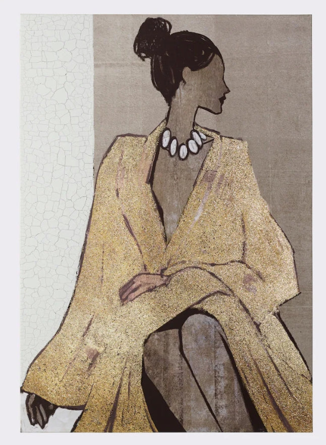 Bild Dame. Hochwertiger Kunstdruck, teils von Hand bemalt, teils in Craquelé-Optik, mit goldfarbenem Glitzereffekt. Abweichungen möglich. Kunstleinwand auf Holzrahmen gezogen.