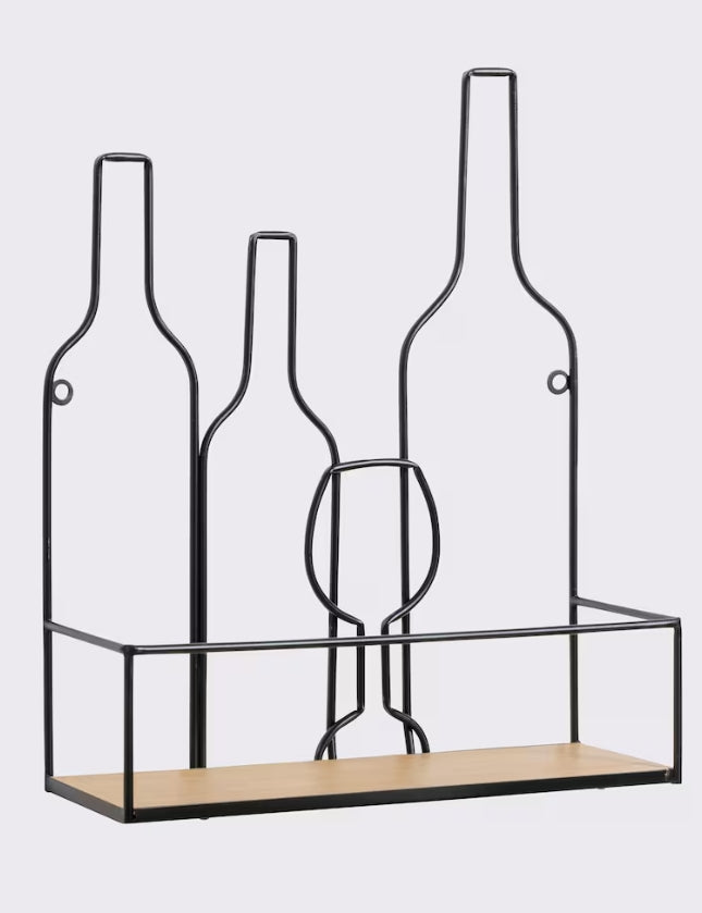 Regal Mit originellem Weinflaschen-Motiv. Aus schwarz lackiertem Metall, Ablage aus MDF-Holzfaserplatte. Zur Wandmontage. Aufgebaut.
