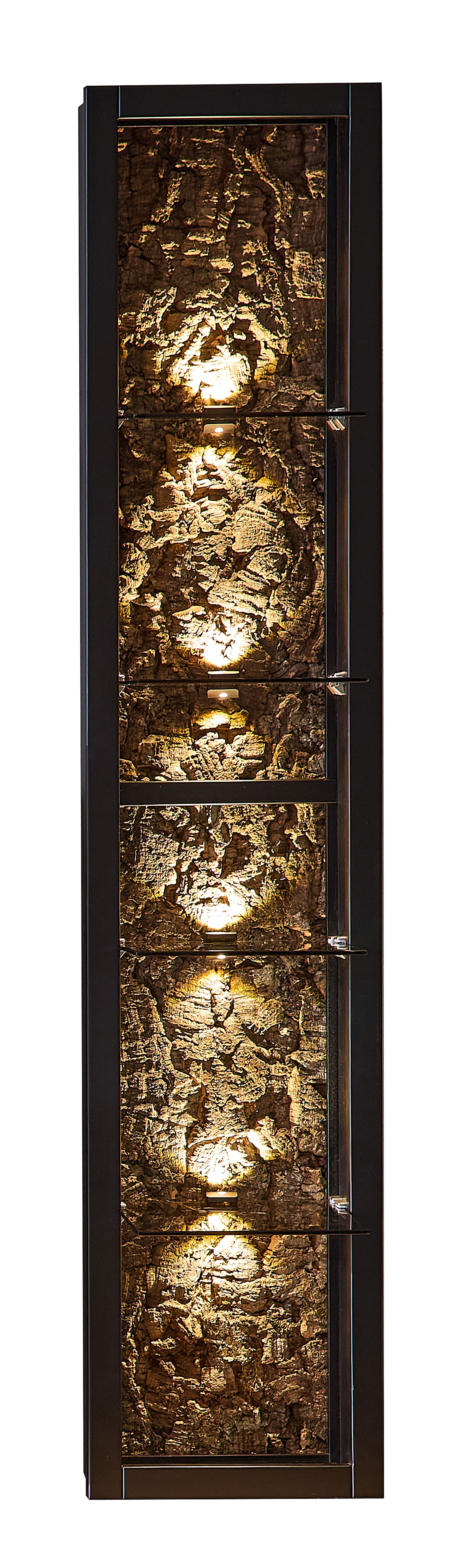 Korpus: aussen Wildeiche massiv, durchgehende Lamelle, innen keilverzinkt, sichtbare Rückwände Natur-Kork, Korpus gerundet