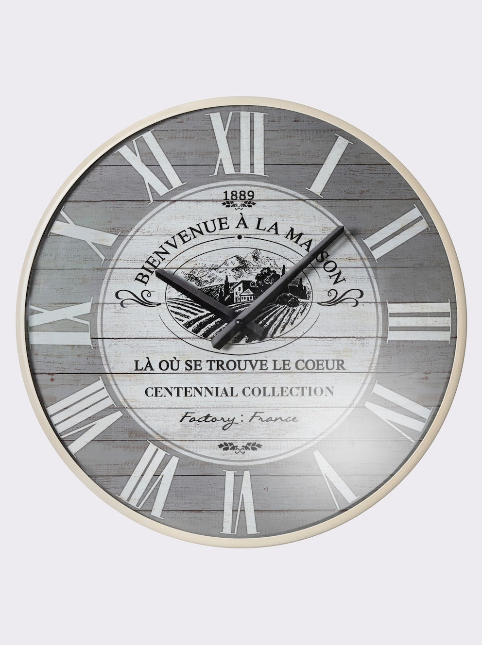 Wanduhr Aus Metall, Rahmen cremefarben lackiert. Zifferblatt grau bedruckt, mit Acrylglas-Abdeckung. Ohne 1x1,5V-Mignon-Batterie.